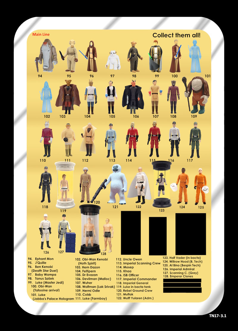 Includes: - Luke action figure (5POA) - 1 softgoods gown - 1 softgoods belt - 1 space window backdrop - 1 cardboard medical bay playset (med chair + comp console)